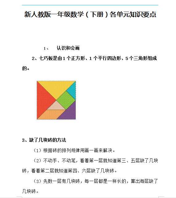 新人教版小学一年级数学(下册)各单元知识要点
