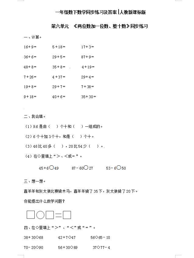【精品】小学一年级下册数学同步练习-《两位数加一位数、整十数》1-人教新课标(4页DOC文档) 资料下载