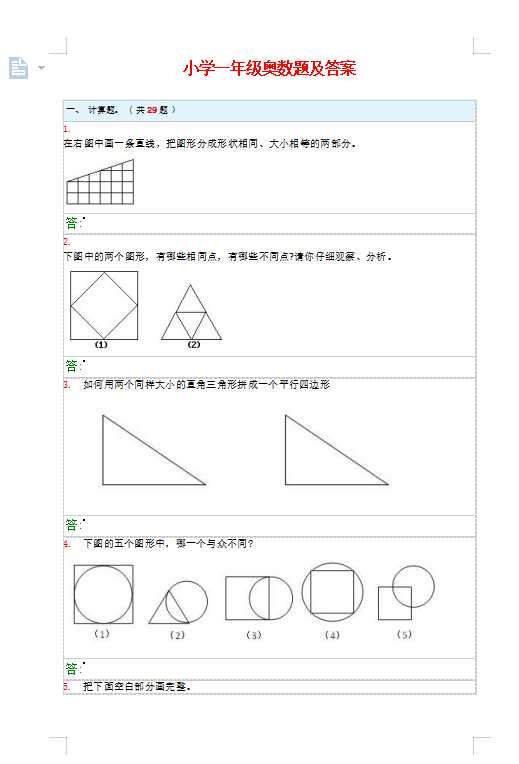 小学一年级奥数题及答案(20页word文档)电子档可打印版资料下载