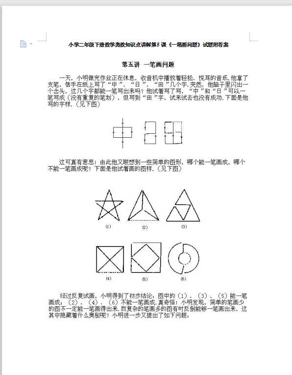 当前位置: 首页二年级二年级奥数正文 小学二年级下册数学奥数知识点讲解第5课《一笔画问题》试题附答案(DOC文档6页电子档下载) 声明:本站所有文章,如无特殊说明或标注,均为本站原创发布。任何个人或组织,在未征得本站同意时,禁止复制、盗用、采集、发布本站内容到任何网站、书籍等各类媒体平台。如若本站内容侵犯了原著者的合法权益,可联系我们进行处理。二年级奥数二年级数学 admin 海报 链接