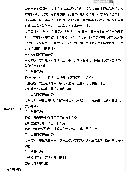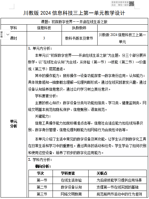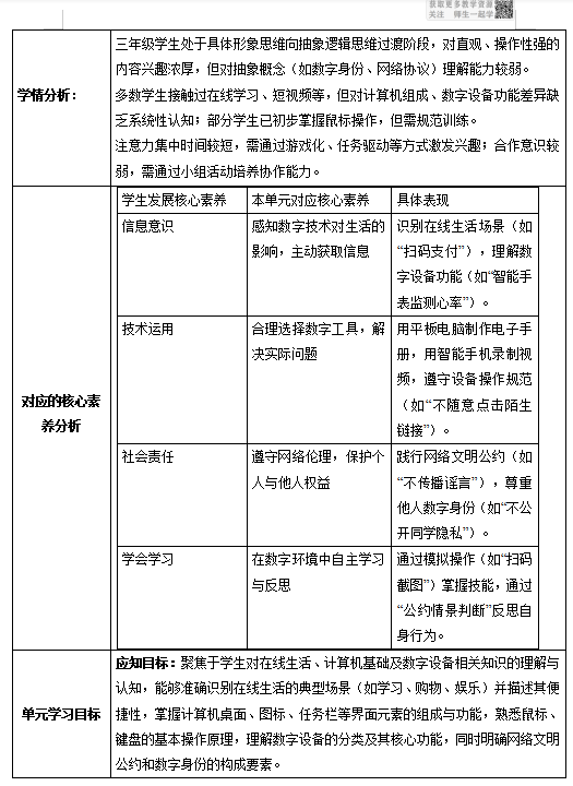 信息科技三年级上册第一单元分析解读,供6页,包含单元内分析、学科要素分析、学科内分析(横向和纵向)、跨学科分析、学情分析、核心素养分析、目标及评价任务分析、课时分配及单元作业设计,可更改,内容如下: