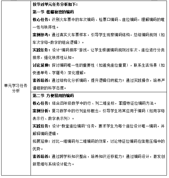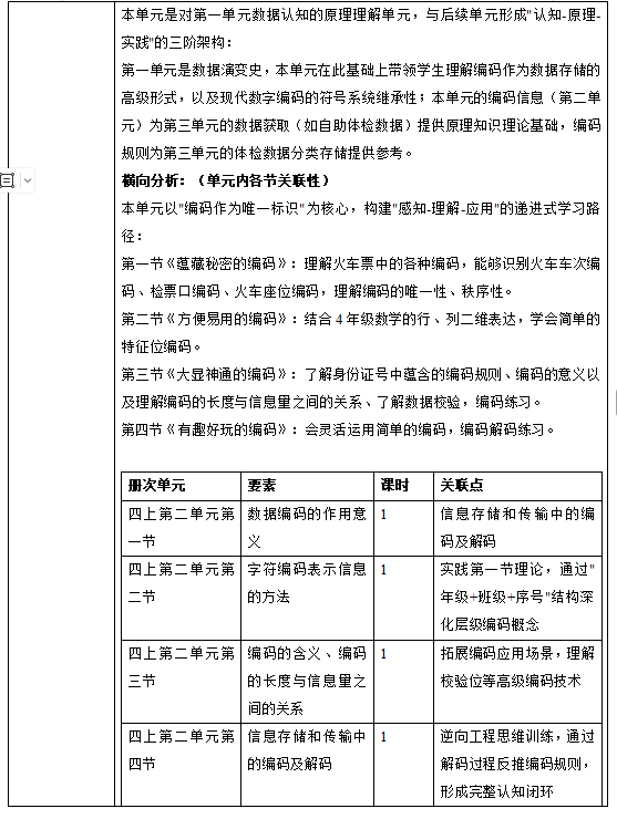 信息科技四年级上册第二单元分析解读,供7页,包含单元内分析、学科要素分析、学科内分析(横向和纵向)、跨学科分析、学情分析、核心素养分析、目标及评价任务分析、课时分配及单元作业设计,可更改,内容如下: