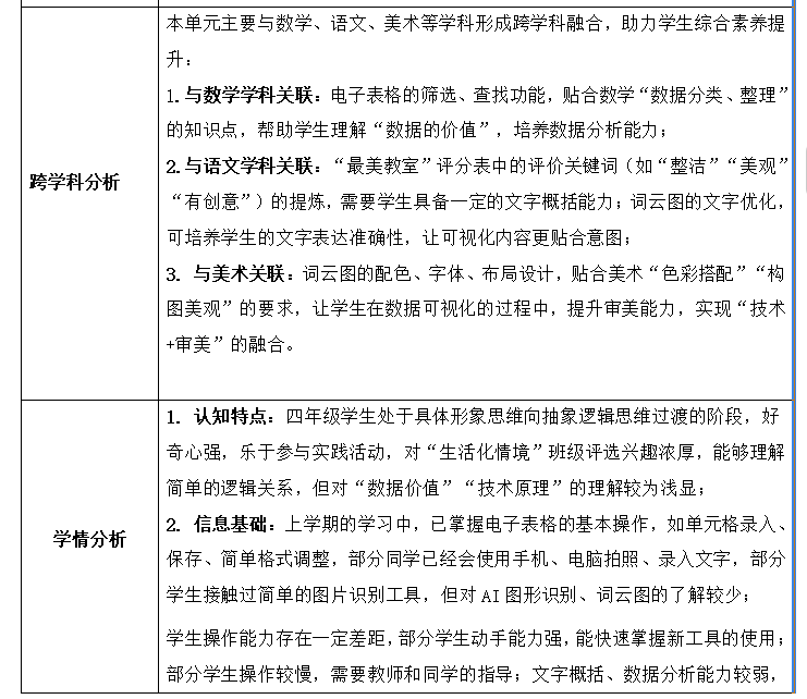 信息科技四年级下册第一单元分析解读,供6页,包含单元内分析、学科要素分析、学科内分析(横向和纵向)、跨学科分析、学情分析、核心素养分析、目标及评价任务分析、课时分配及单元作业设计,可更改,内容如下: